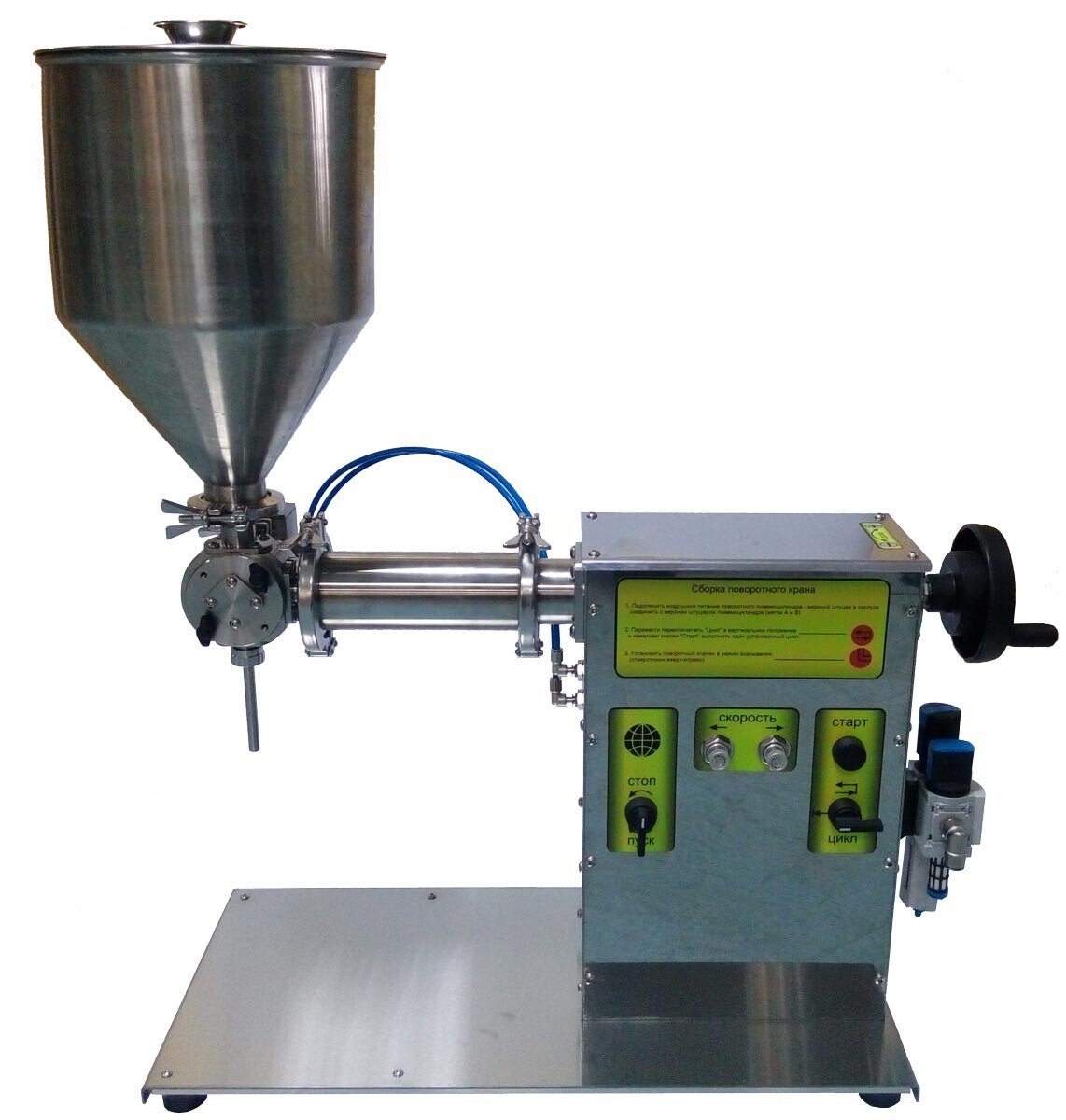 Пневматическая настольная машина для наполнения флаконов и банок жидкими и густыми продуктами (крема, пасты).